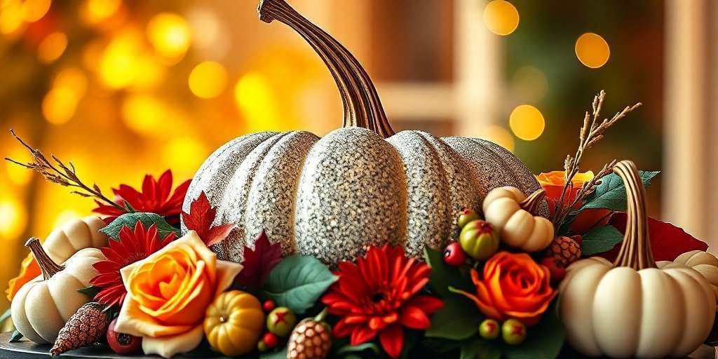 The design incorporates stunning floral accents alongside sparkling pumpkin elements. This creative combination captures the essence of fall, making it ideal for seasonal events. The warm and vibrant color palette evokes feelings of joy and festivity, perfectly aligning with autumnal themes.